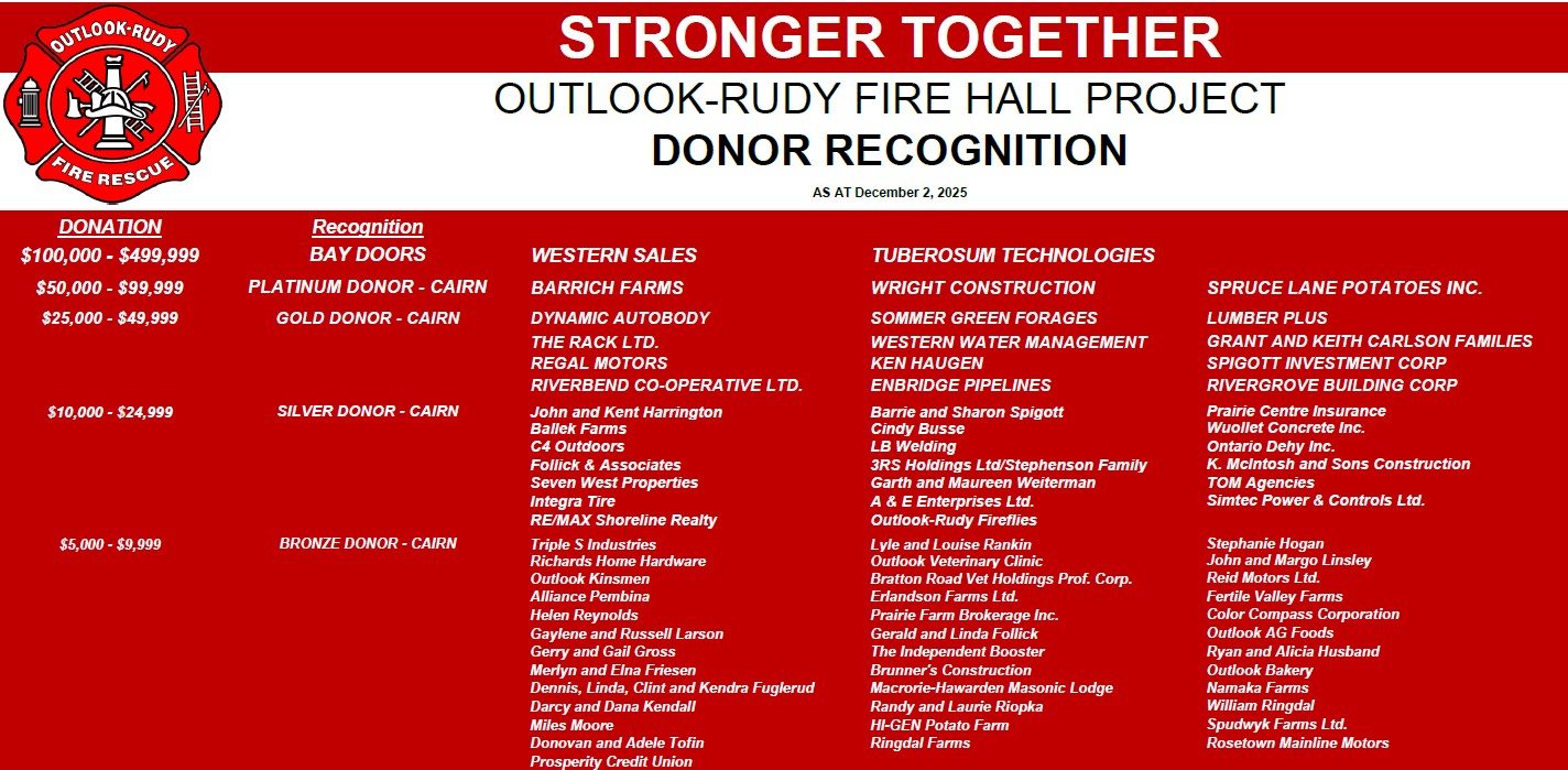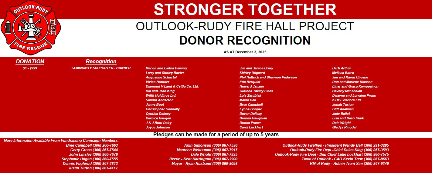 As part of a strategic planning process in October, 2021, the RM of Rudy and Town of Outlook formed a partnership agreement to provide a valuable level of fire and protection service to the region up to 2030 and beyond. All municipal partners are involved in planning and are invested in the project. This agreement serves the Rural Municipality, the Town and the Villages of Broderick and Glenside, and is united under the name of Outlook-Rudy Fire and Rescue (ORFR).