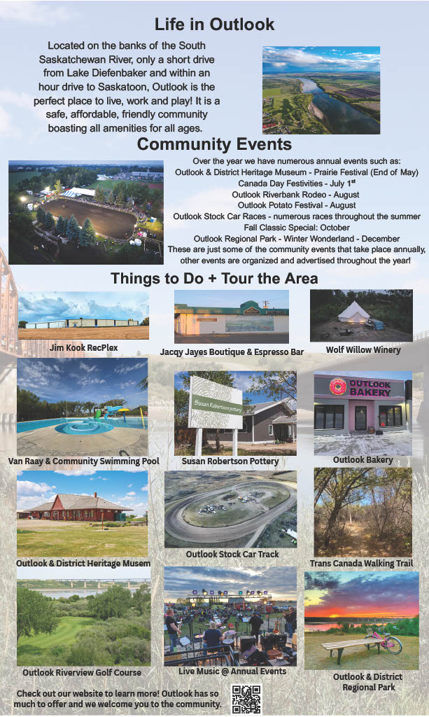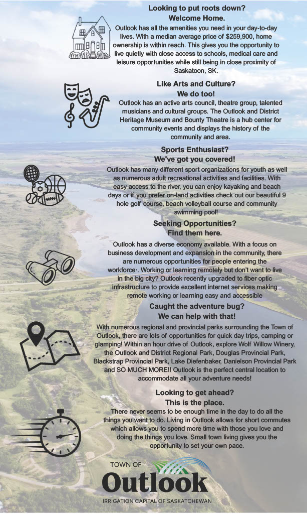 Located on the banks of the South Saskatchewan River, only a short drive from Lake Diefenbaker and less than an hour south of Saskatoon, Outlook is the perfect place to live work and play! It is a safe, affordable, friendly community boasting amenities for all ages and interests. As the home to the largest irrigation project in the province, Outlook is known as the "Irrigation Capital of Saskatchewan."