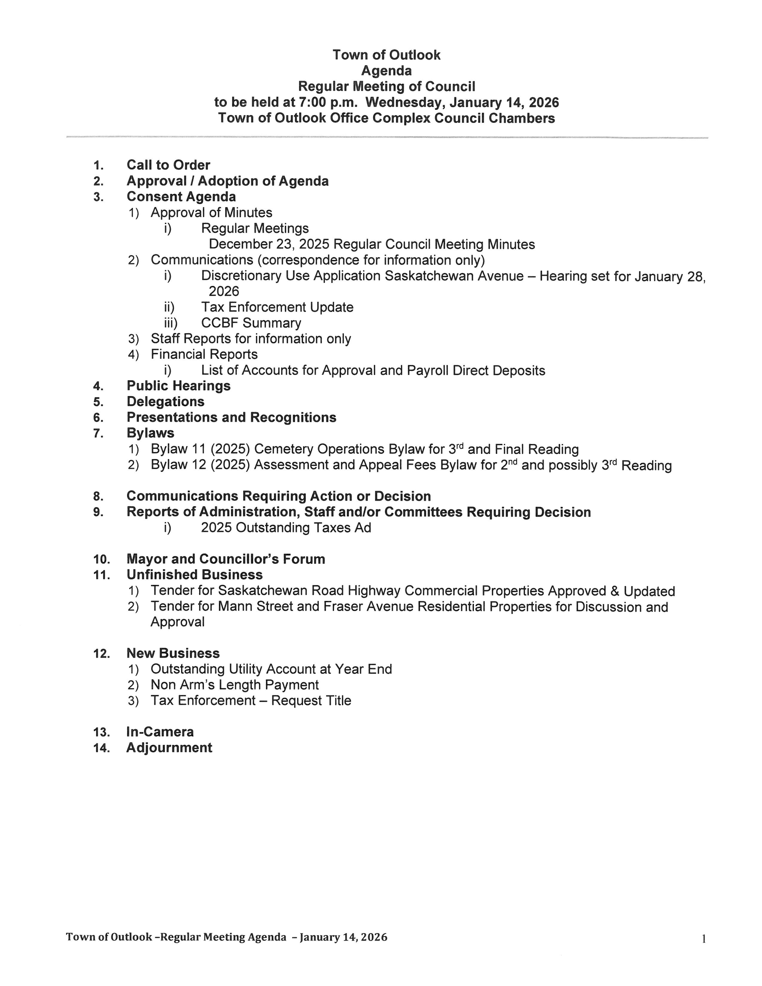 January 14, 2026 Regular Council Meeting Agenda